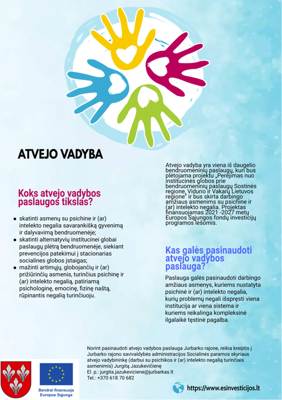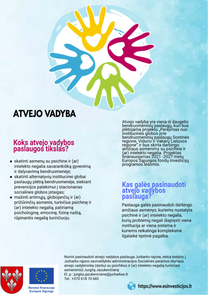 Atvejo vadyba yra viena iš daugelio bendruomeninių paslaugų, kuri bus plėtojama projektu „Perėjimas nuo institucinės globos prie bendruomeninių paslaugų Sostinės regione, Vidurio ir Vakarų Lietuvos regione“ ir bus skirta darbingo amžiaus asmenims su psichine ir (ar) intelekto negalia. Projektas finansuojamas 2021-2027 metų Europos Sąjungos fondų investicijų programos lėšomis.